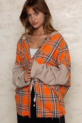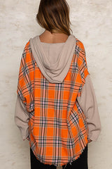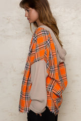 Contrast Sleeves Hooded Plaid Shirt Orange