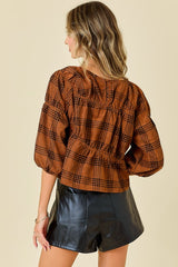 Corduroy Round Neck Plaid Top Brown