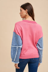 Denim Sleeve Contrast Distressed Top Hot Pink