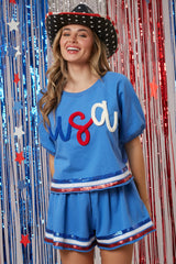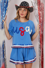 'USA' Embroidery Puff Sleeve Crop Top Blue