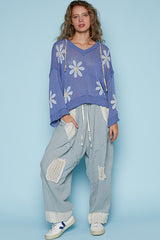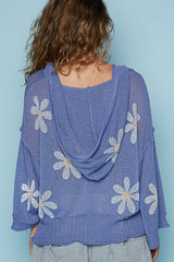 V-Neck Floral Print Hoodie Sweater Evening Blue