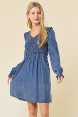 V-Neck Smocked Mini Dress Dark Denim