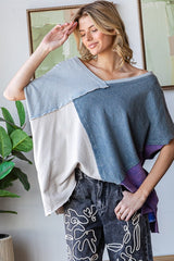 Washed Colorblock Wide V-Neck Top Blue