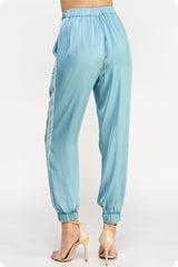 Tuxedo Lace Detail Satin Jogger Pants Blue