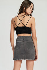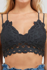 Double Strap Scalloped Lace Bralette. Floral Nylon Raschel Lace. Adjustable Elastic Straps. Double Shoulder Straps/ Smocked Bandeau Back. X Strap Back Detail. Scalloped Edge.