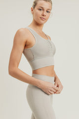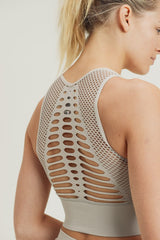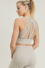 This unique sports bra is such a statement piece. It blends lattice-style mesh. with laser cut design on front as back for a bold look.