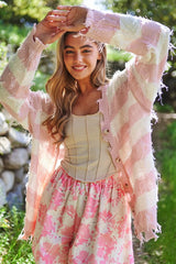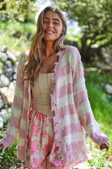 Distressed Fringe Stripe Cardigan Strawberry Milk