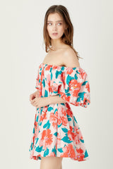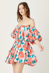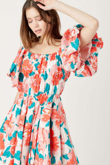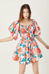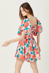 Bubble Sleeve Flare Mini Dress Coral Floral