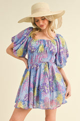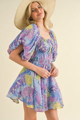 Bubble Sleeve Mini Dress Blue Multi Floral