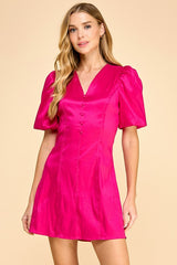 Faux Button Detail Short Puff Sleeves Dress Magenta