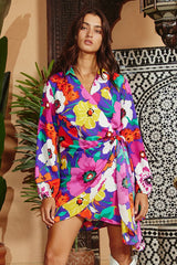 Floral Print Puff Wrap Mini Dress Multi