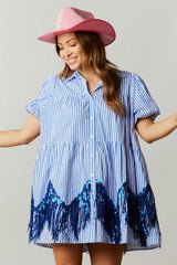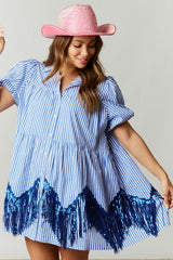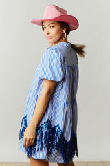 Fringed Stripe Print Shirt Dress w/Sequins Blue