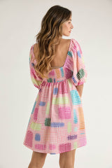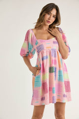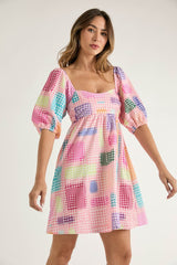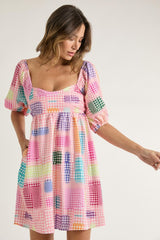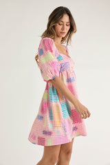 Houndstooth Pattern Puff Sleeve Dress Pink