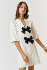 Linen Front Bow Detail Mini Dress Ivory/Black