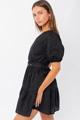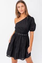 One Shoulder Short Sleeve Tiered Dress Black