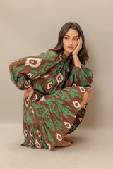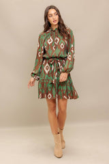 Ruffled Hem Printed Mini Dress Brown Green