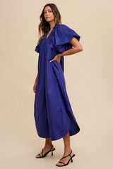 Smocked Detail Puff Sleeve Midi Dress Blue