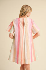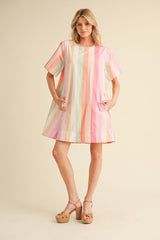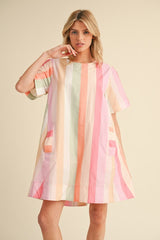 Stripes Print Dress with Pockets Pink Mix