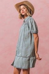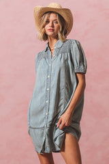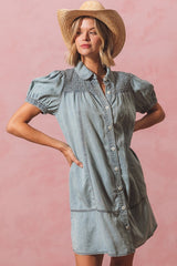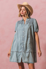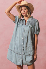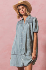 Washed Denim Smocked Yoke Shirt Dress Light Denim