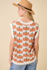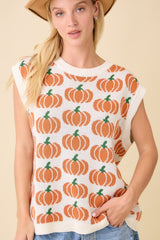 Pumpkin Print Sleevless Sweater Knit Top Ivory