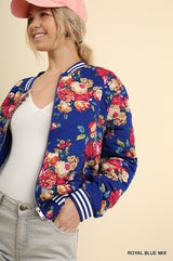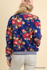 Floral Print Quilted Bomber Zip Jacket Royal Blue
