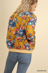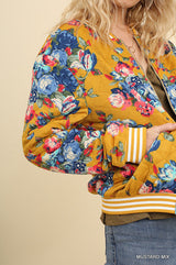Floral Print Quilted Bomber Zip Jacket Mustard