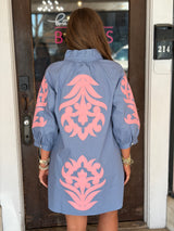Baroque Floral Applique Shift Dress Blue/Pink