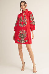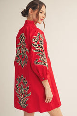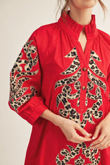 Baroque Floral Applique Shift Dress Red