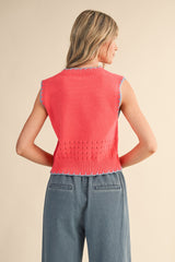 Blanket Stitch Pointelle Sweater Vest Coral/Blue