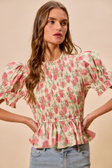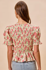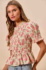 Floral Rose Print Smocked Top Pink