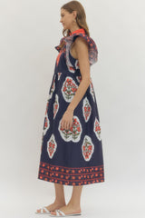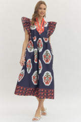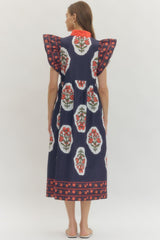 Floral Tiered Flutter Sleeve Midi Dress Navy