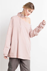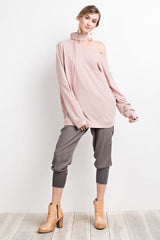 Soft Knit Topped with a Mock Neck Lace Up Detailing Long Sleeve. Features a cutout at the shoulder + collarbone. Light Terry Knit Loose Fit Top