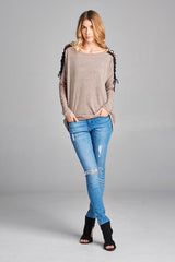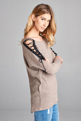 Fitted Rib Knit Top with Long Sleeves & Lace Up Eyelets at the Shoulders. Made out of two toned Hacci Rib Knit.