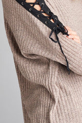 Long Sleeve Rib Knit Lace Up Taupe