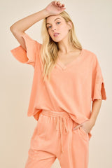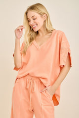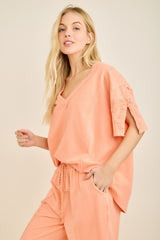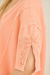 Mineral Washed Cute Bow Trim Slit Top Papaya