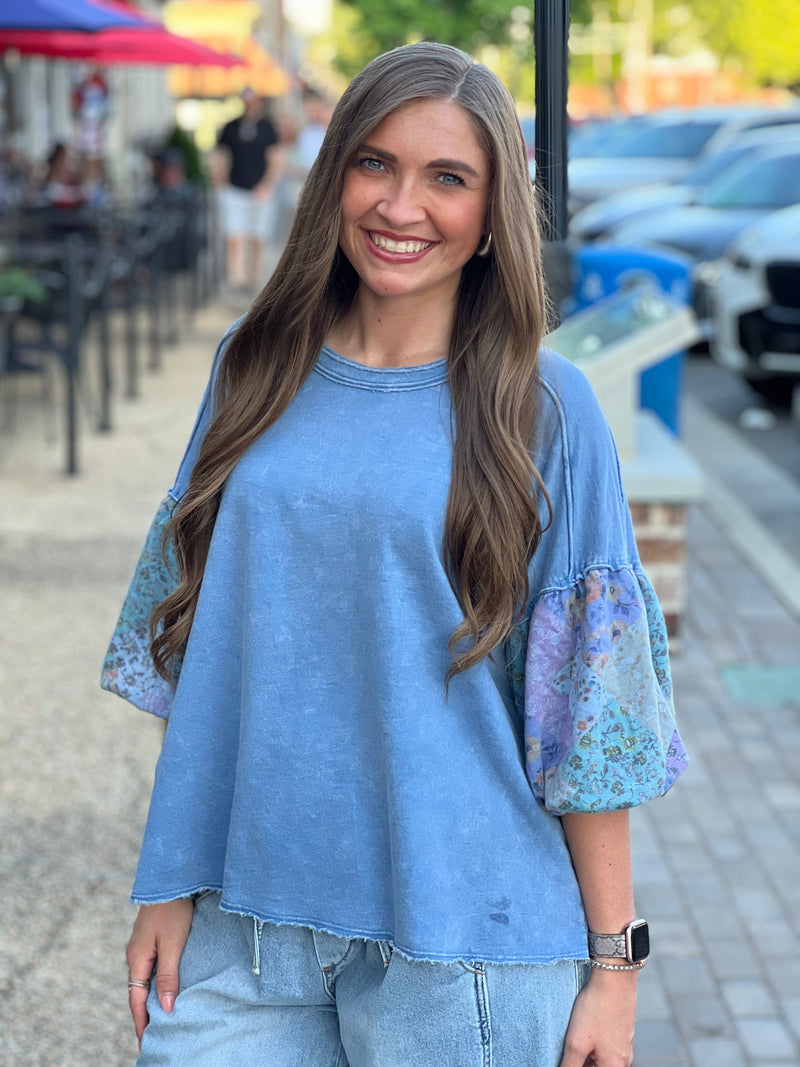 Mineral Washed Floral Patch Puffsleeve Top Denim