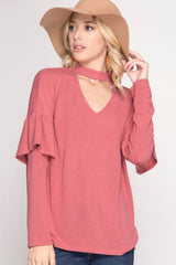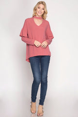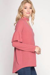 Mock Neck Top with Ruffle Arms Dusty Rose