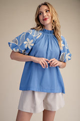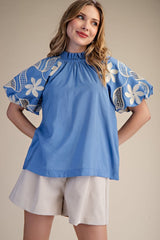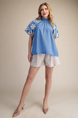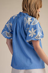 Ruffle Neck Bubble Sleeve Blouse Blue
