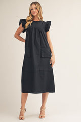 Ruffle Sleeves Solid Midi Dress Black