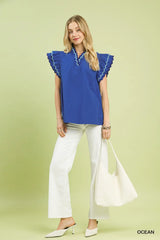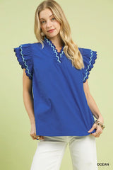 Scallop Trim Ruffle Sleeve Top Ocean