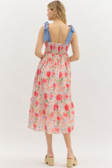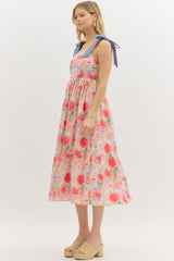 Floral Print Bow Shoulder Midi Dress Red