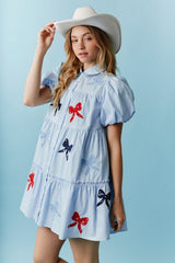 Lace Laser Cut Bow Embroidery Mini Dress Blue