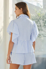 Ruffle Sleeves Pintuck Detail Striped Top Blue