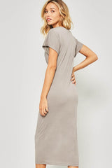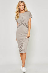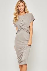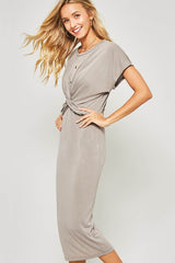 A premium modal knit dress featuring round neckline, short dolman sleeves, and twisted knotted front detail. This dress is made with a medium weight fabric that is very soft and drapes well.