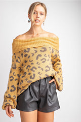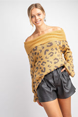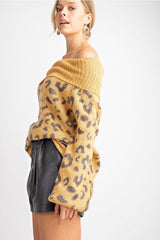 Leopard Pattern Cowl Neck Pullover Knitted Sweater. Off the Shoulder with Balloon Sleeve & Ribbed Hem