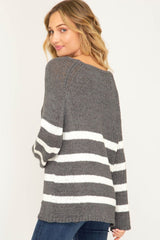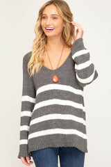 Long Sleeve Striped V-Neck Knit Sweater Grey