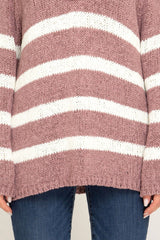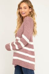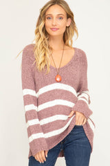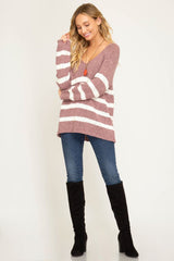 Long Sleeve Striped V-Neck Knit Sweater Rose