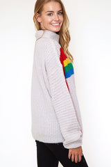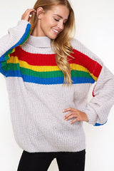 Rainbow stripe chunky sweater featuring turtle neck, long balloon sleeves, and loose-fit silhouette.