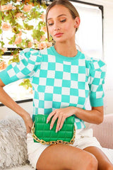 Checker Board Print Knit Top Aqua