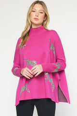 Cheetah Print Mock Neck Sweater Top Hot Pink